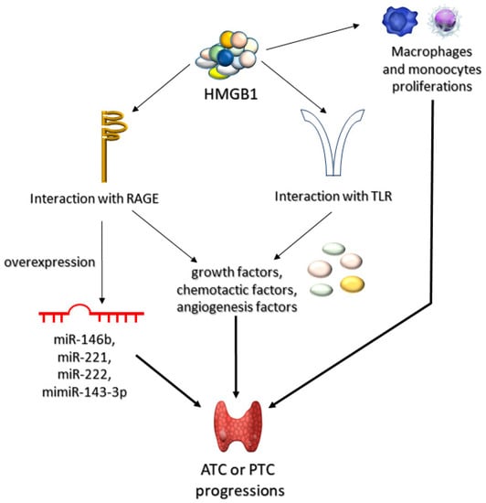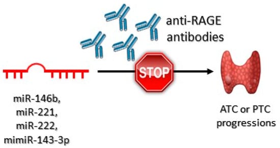 158. Mardente, S.; Mari, E.; Consorti, F.; Di Gioia, C.; Negri, R.; Etna, M.; Zicari, A.; Antonaci, A. HMGB1 induces the overexpression of miR-222 and miR-221 and increases growth and motility in papillary thyroid cancer cells. Oncol. Rep. 2012, 28, 2285–2289. [Google Scholar] [CrossRef]