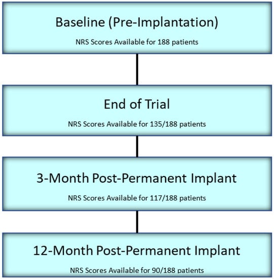 In this study, a total of 188 permanently implanted patients were evaluated. Data were collected and assessed from 135, 117, and 90 patients at the completion of trial implantation, 3 months after permanent implant, and 12 months after permanent implant, respectively (Figure 1). Among all included patients, 101 of them were female. On average, patients were 60.0 ± 12.3 years of age with 85.6% reporting low back and leg pain, and were diagnosed with one or more of the following: Lumbosacral Radiculopathy (21%), Failed Back Surgery Syndrome (64%), and Compressive Myelopathy from Spinal Stenosis (9%). Baseline (pre-trial) NRS scores were available for all patients, with a mean of 7.9 ± 1.7 (n = 188). The mean follow-up (last follow up) duration was found to be 296 ± 207 days (n = 187) (Table 1).