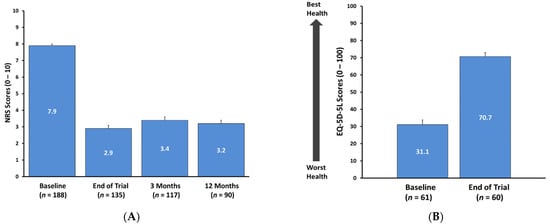 (A) Baseline, end of trial, and 3 and 12 months post-implant mean overall NRS pain scores. Error bars signify standard error (SE). p < 0.0001. (B) Overall quality of life, as assessed by EQ-5D-5L at Baseline and Last follow up. Error bars represent standard error (SE).