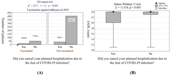 (A) Number (n) and percentage (%) of elderly patients in groups differing on those vaccinated against influenza or not in 2019, (B) Mann–Whitney U test showing the significant correlation between patients who are less fit (according to IADL scale) and canceled planned hospitalization due to the fear of COVID-19 infection.