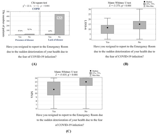 Out of a total of 500 participants, 32 (6.4%) resigned from admission to the Emergency Room due to the sudden deterioration of health (Table 2, question 6). Most of those patients suffered from coronary heart disease (p = 0.014, Table S2), COPD (p < 0.001, Figure 2A, Table S2) and heart failure (p = 0.009, Table S2). Similar to planned hospitalizations, patients did not show up in the Emergency Room after they were recommended by a GP doctor to be vaccinated against influenza and pneumococci (p = 0.032, Table S2). Furthermore, patients who take cardiac drugs (p = 0.012, Table S2) have difficulties with depression (according to GDS-15 scale, p < 0.001, Table S2), anxiety (according to GAS-10 scale, p < 0.001, Table S2), social loneliness (according to LSNS-6 scale, p < 0.001, Figure 2B, Table S2) and those with malnutrition (according to MNA scale, p < 0.001, Figure 2C, Table S2) also resigned to report to the Emergency Room more often compared to physically and mentally healthy patients.