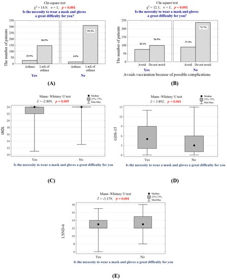 During the interviews, patients were also asked if wearing masks makes them feel uncomfortable. Thus, the difficulty of wearing masks was observed among 174 (34.8%) patients, mainly in those suffering from asthma (p < 0.001, Figure 3A, Table S3), COPD (p = 0.008, Table S3), and heart failure (p < 0.001, Table S3). Moreover, it occurred significantly more often in participants who are afraid of vaccination because of potential side effects (p < 0.001, Figure 3B, Table S3), those willing to be vaccinated against influenza but could not undergo vaccination due to the lack of vaccines in pharmacies (p = 0.013, Table S3) and those who take cardiac drugs (p = 0.042, Table S3) and analgesics (p = 0.019, Table S3). Moreover, difficulties with wearing masks and/or gloves were significantly more often observed in patients assessing more complex daily activities (p = 0.005, Figure 3C, Table S3), with depression according to GDS-15 (p < 0.001, Figure 3D, Table S3), with a higher level of anxiety according to GAS-10 (p < 0.001, Table S3), and with a higher level of social loneliness according to LSNS-6 (p = 0.001, Figure 3E, Table S3).