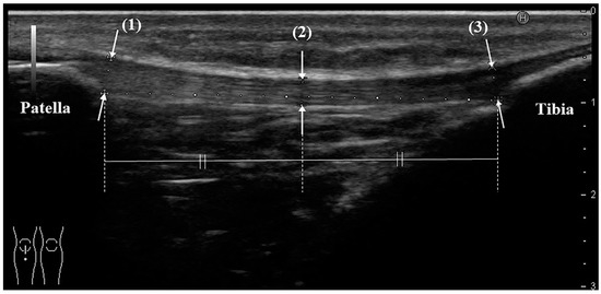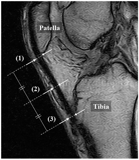 MRI was performed using a 0.18-T extremity MRI device C-Scan (Esaote S.p.A, Genova, Italy). As with the US measurement, the patients were placed in a supine position, with a knee flexion of 30 degrees. The scan was performed according to the knee protocol set by the device, with a sagittal gradient echo (matrix 288 × 200; repetition time (TR) 580, msec/echo time (TE) 16 msec; field of view 190 mm; slice thickness 4.0 mm; flip angle 75 degrees). In the slice at the center of the patellar tendon, the tendon thicknesses were measured at the same points as those measured with US (