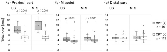 Table 1 shows the participants’ average patellar tendon thickness measured using US and MRI. When the knees with and without CPT were compared, the proximal patellar tendon for knees with CPT was significantly thicker on both US and MRI (US: 8.3 ± 1.5 mm vs. 5.1 ± 1.0 mm,