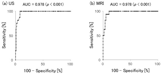 p < 0.001) for both US and MRI, showing no significant difference between these imaging studies. Our analysis also showed that the Youden index values were a thickness of 6.67 mm (sensitivity 100%, specificity 92.0%) for US and a thickness of 7.08 mm (sensitivity 100%, specificity 89.4%) for MRI. Furthermore, when the cutoff candidate value was set to a thickness of >7.0 mm (integer), the sensitivity was 81.3% and the specificity was 95.6% for US, while the sensitivity was 100% and the specificity was 89.4% for MRI. Thus, the thickness of the proximal patellar tendon measured by either US or MRI was an accurate predictor of CPT.