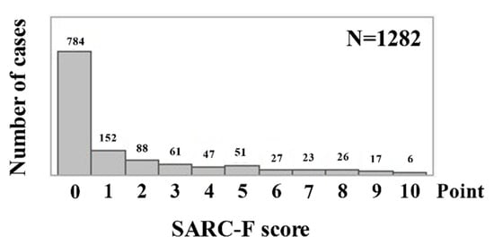 Baseline characteristics for all cases (n = 1282, 762 males and 520 females, median (IQR) age = 71 (61–78) years) are presented in Table 1. The median (IQR) BMI was 22.1 (19.6–24.3) kg/m2. The median (IQR) serum albumin level was 3.8 (3.3–4.1) g/dL. UGD was found in 326 patients (advanced cancer cases of UGD: 108 (33.1%)), LGD in 357 (advanced cancer cases of LGD: 82 (23.0%)), BPD in 416 (advanced cancer cases of BPD: 93 (22.3%)), and LD in 183 (advanced cancer cases of LD: 56 (30.6%)). Overall, advanced cancer cases were noted in 339 patients (26.4%). The number of cases according to the SARC-F scores is shown in Figure 1. Patients’ SARC-F of 0 points were observed in 784 cases (61.2%), SARC-F of 1 point in 152 (11.9%), SARC-F of 2 points in 88 (6.9%), SARC-F of 3 points in 61 (4.8%), and SARC-F of ≥4 points in 197 (15.4%).