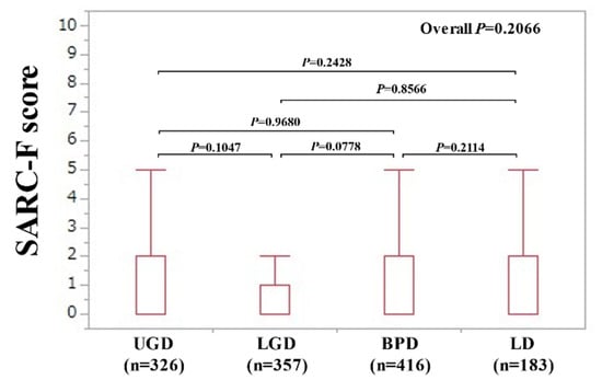 The median (IQR) SARC-F scores in the disease groups were the following: 0 (0–2) in UGD, 0 (0–1) in LGD, 0 (0–2) in BPD, and 0 (0–2) in LD (p values: UGD vs. LGD, p = 0.1047; UGD vs. BPD, p = 0.9680; UGD vs. LD, p = 0.2428; LGD vs. BPD, p = 0.0778; LGD vs. LD, p = 0.8566; BPD vs. LD, p = 0.2114; overall p = 0.2066) (Figure 2).