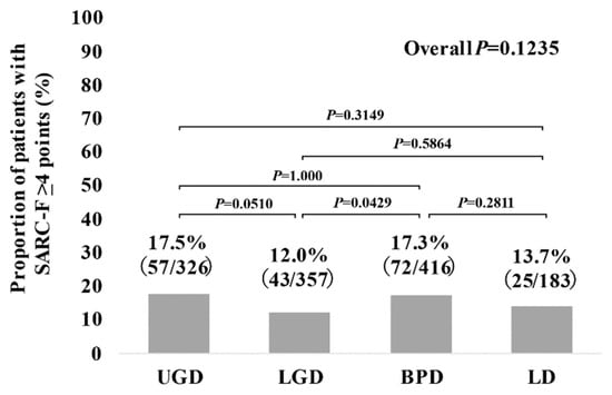 The proportions of SARC-F ≥4 points in the disease groups were 17.5% (57/326) in UGD, 12.0% (43/357) in LGD, 17.3% (72/416) in BPD, and 13.7% (25/183) in LD (p values: UGD vs. LGD, p = 0.0510; UGD vs. BPD, p = 1.000; UGD vs. LD, p = 0.3149; LGD vs. BPD, p = 0.0429; LGD vs. LD, p = 0.5864; BPD vs. LD, p = 0.2811; overall p = 0.1235) (Figure 3).