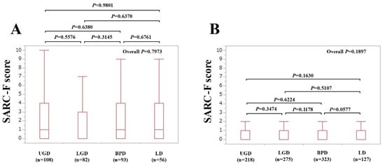 The median (IQR) SARC-F scores in the groups of UGD, LGD, BPD, and LD patients with advanced cancer (n = 339) were the following: 1 (0–4) in UGD (n = 108), 0 (0–3) in LGD (n = 82), 1 (0–4) in BPD (n = 93), and 1 (0–4) in LD (n = 56) (p values: UGD vs. LGD, p = 0.5576; UGD vs. BPD, p = 0.6380; UGD vs. LD, p = 0.9801; LGD vs. BPD, p = 0.3145; LGD vs. LD, p = 0.6370; BPD vs. LD, p = 0.6761; overall p = 0.7973) (Figure 4A).