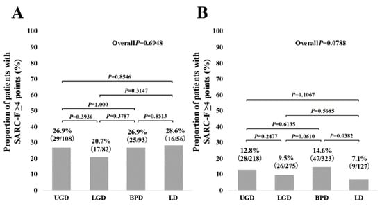 The proportions of SARC-F ≥4 points in the groups of UGD, LGD, BPD, and LD in patients with advanced cancer were 26.9% (29/108) in UGD, 20.7% (17/82) in LGD, 26.9% (25/93) in BPD, and 28.6% (16/56) in LD (p values: UGD vs. LGD, p = 0.3936; UGD vs. BPD, p = 1.000; UGD vs. LD, p = 0.8546; LGD vs. BPD, p = 0.3787; LGD vs. LD, p = 0.3147; BPD vs. LD, p = 0.8513; overall p = 0.6948) (Figure 5A).