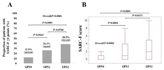 (A) The proportion of patients with SARC-F ≥4 points according to Glasgow prognostic scores (GPSs). (B) SARC-F scores according to GPSs.