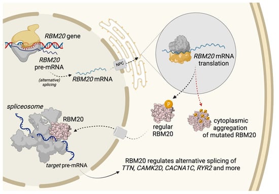 Modified from Schneider et al., 2019 [22]. RBM20 synthesis, trafficking and pathological cytoplasmic aggregation of RBM20-mutations. RBM20 is transcribed and its mRNA translocated through the nuclear pore complex (NPC) to the cytoplasm, where the RBM20 protein is translated. Regular RBM20 is transported back to the nucleus where it regulates alternative splicing as a part of the spliceosome. Disruption of nuclear transport processes in the presence of RBM20 mutations, however, may promote cytoplasmic protein aggregation, amongst other things by aberrant phosphorylation of the RS-Domain. This caused mislocalization may explain the altered splicing of target genes in the presence of RBM20 mutations.