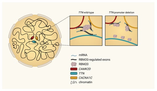 In human embryonic stem cells (hESC), the team discovered that TTN pre-mRNA, the best-studied RBM20-regulated transcript in the heart, binds and accumulates RBM20 foci near its genomic locus. This RBM20 accumulation mediates spatial proximity between the TTN locus and other inter-chromosomal RBM20 targets like CAMK2D or CACNAC1C (Figure 3). Changes in the topological assembly of the involved targets, for example, due to experimental deletion of the TTN promoter in hESC significantly reduced the spatial concentration of RBM20 genome-foci [50]. This is consecutively resulting in an altered RBM20-dependent alternative splicing activity of the other targets involved [50]. These novel perceptions indicate the existence of a cardiac-specific trans-interacting chromatin domain (TID) functioning in the sense of a splicing factory [50].