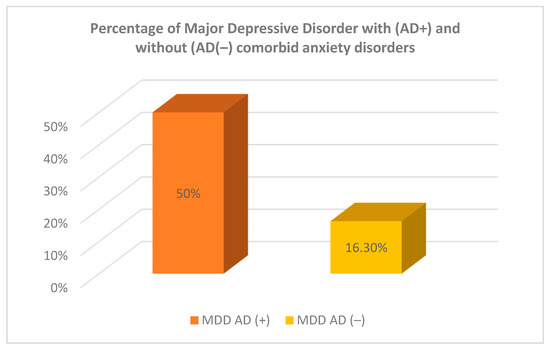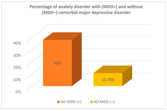 In the study sample, eight patients (8.3% of the study sample, n = 96) had two comorbid disorders: major depressive disorder and anxiety disorder (Table 2, Figure 1). When looking at comorbidity of each diagnosis separately, it was determined that 50% individuals with anxiety disorder had comorbid MDD and 38% patients with MDD had comorbid anxiety disorder (Figure 2).