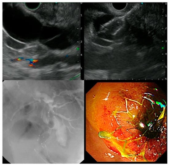 - Ogura, T.; Chiba, Y.; Masuda, D.; Kitano, M.; Sano, T.; Saori, O.; Yamamoto, K.; Imaoka, H.; Imoto, A.; Takeuchi, T.; et al. Comparison of the Clinical Impact of Endoscopic Ultrasound-Guided Choledochoduodenostomy and Hepaticogastrostomy for Bile Duct Obstruction With Duodenal Obstruction. Endoscopy 2016, 48, 156–163. [Google Scholar] [PubMed]
