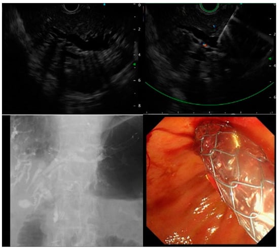 - Nakai, Y.; Isayama, H.; Kawakami, H.; Ishiwatari, H.; Kitano, M.; Ito, Y.; Yasuda, I.; Kato, H.; Matsubara, S.; Irisawa, A.; et al. Prospective Multicenter Study of Primary EUS-Guided Choledochoduodenostomy Using a Covered Metal Stent. Endosc. Ultrasound 2019, 8, 111–117. [Google Scholar] [PubMed]