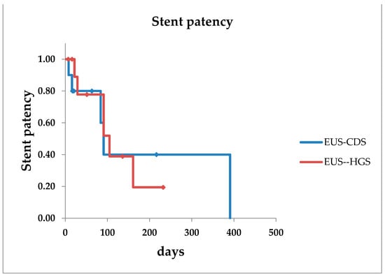 Stent patency of EUS-CDS and EUS-HGS. The stent patency period is 91 days in the EUS-CDS group and 101 days in the EUS-HGS group. EUS-CDS: endoscopic ultrasound-guided choledochoduodenostomy, EUS-HGS: endoscopic ultrasound-guided hepaticogastrostomy.