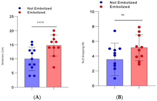 - The mean dimension of the hematoma was 10 cm (±1.25 SD) for the not-embolized group vs. 14.75 cm (±1.2 SD) for the embolized group (p = 0.0128), Figure 1A.