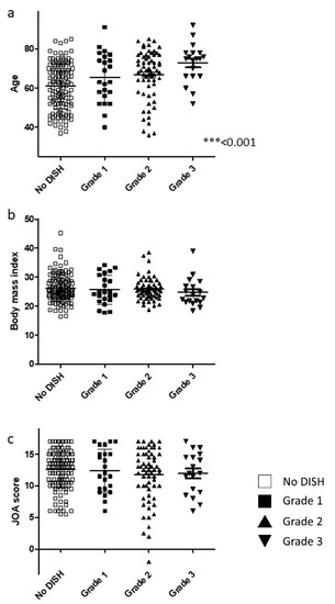 Relationship between basic demographic and clinical findings and DISH grade. (a) Patient age. (b) Body mass index. (c) JOA score. DISH, diffuse idiopathic skeletal hyperostosis; JOA, Japanese Orthopaedic Association.