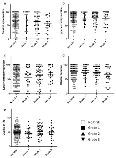 Relationship between JOA-CMEQ scores and DISH grade. (a) Cervical function. (b) Upper extremity function. (c) Lower extremity function. (d) Bladder function. (e) Quality of life. DISH, diffuse idiopathic skeletal hyperostosis; JOA-CMEQ, Japanese Orthopaedic Association Cervical Myelopathy Evaluation Questionnaire.