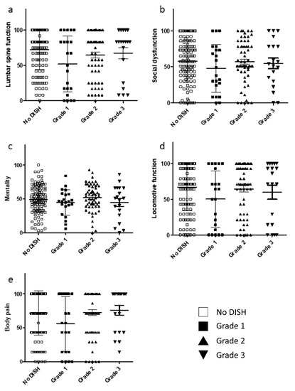 Relationship between JOA-BPEQ and DISH grade. (a) Lumbar function. (b) Social dysfunction. (c) Mentality. (d) Locomotive function. (e) Body pain. DISH, diffuse idiopathic skeletal hyperostosis; JOA-BPEQ, Japanese Orthopaedic Association Back Pain Evaluation Questionnaire.