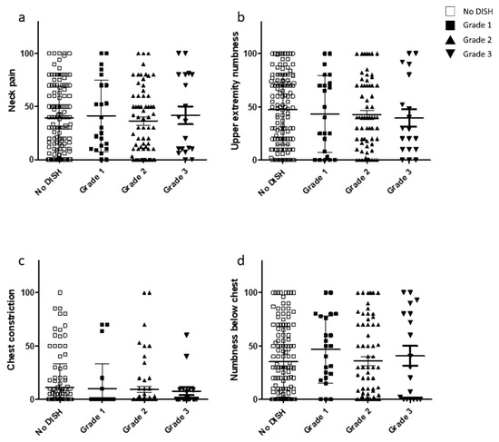 Relationship between the VAS scores included in the JOA-CMEQ and DISH grade. VAS scores for (a) neck pain, (b) upper extremity numbness, (c) chest constriction, and (d) numbness below the chest. DISH, diffuse idiopathic skeletal hyperostosis; JOA-CMEQ, Japanese Orthopaedic Association Cervical Myelopathy Evaluation Questionnaire; VAS, visual analog scale.
