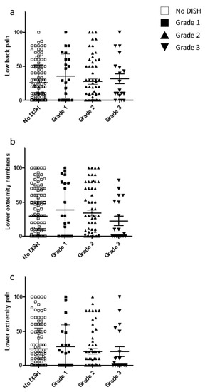 Relationship between the VAS scores included in the JOA-BPEQ and DISH grade. VAS scores for (a) low back pain, (b) lower extremity numbness, and (c) lower extremity pain. DISH, diffuse idiopathic skeletal hyperostosis; JOA-BPEQ, Japanese Orthopaedic Association Back Pain Evaluation Questionnaire; VAS, visual analog scale.