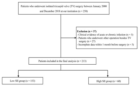Systemic inflammation plays a central role in cardiovascular disease. Circulating neutrophils and platelets with roles in chronic inflammatory processes and lymphocytes that function throughout subsequent immune responses are important contributors to atherosclerosis [1,2]. Inflammation and immune-based prognostic scores, such as neutrophil/lymphocyte ratio (NLR), platelet lymphocyte ratio (PLR), as well as established pro-inflammatory biomarkers (leukocytosis and C-reactive protein levels) have been shown to predict mortality and morbidity after cardiac surgery [3,4]. Recently, systemic immune-inflammation index (SII), which is a combined indicator of neutrophil, platelet, and lymphocyte levels, has emerged as a prognostic factor for cardiovascular disease. High SII scores have previously been shown to indicate poor prognoses in patients with coronary artery disease, myocardial infarction, and chronic heart disease [5,6,7,8]. However, the association between preoperative systemic inflammation and prognosis of isolated tricuspid valve (TV) surgery has not been reported. Indeed, patients undergoing isolated TV surgery are frequently exposed to chronic inflammation because symptom-based surgical delays, advanced heart failure, and comorbidities, including diabetes, hypertension, hepatic dysfunction, and prior left-side valve surgery, contribute to chronic inflammation state [9]. In addition, isolated TV surgery has been identified as a high-risk surgery with a 10% in-hospital mortality rate and poor long-term outcomes regardless of the improvement of surgical techniques or postoperative management [10,11]. Therefore, efforts need to be made to provide prognostic factors to predict postoperative clinical outcomes, thereby offering appropriate patient selection for surgery.