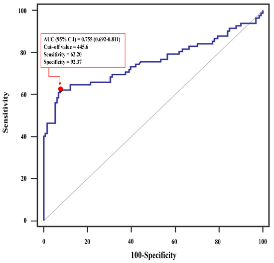 Descriptive analyses are presented as number (proportion), median (inter-quartile range), or mean ± standard deviation, as appropriate. Participant characteristics and postoperative clinical outcomes were compared using chi-square or Fisher’s exact tests for categorical variables and the Student t-test or Wilcoxon rank-sum test for continuous variables. The optimal SII cut-off point was determined by analyzing a composite of major 30-day postoperative complications. The SII cut-off value (455.6 × 109/L) was defined by analyzing receiver operating characteristic (ROC) curves of patients using the Youden index method with and without an endpoint of major 30-day postoperative complications. The method used to determine this cut-off was based on previous reports [16,17].