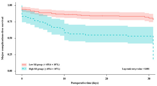 The Kaplan–Meier analysis revealed that the probability of undergoing major 30-day postoperative complications was significantly elevated in patients with higher SII versus lower SII scores (p < 0.001, Figure 3).
