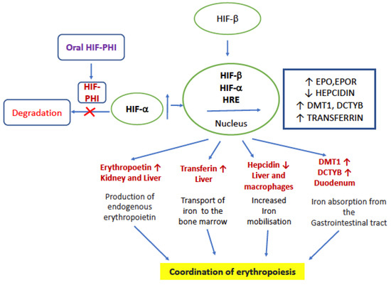 - Liu, Q.; Davidoff, O.; Niss, K.; Haase, V.H. Hypoxia-inducible factor regulates hepcidin via erythropoietin-induced erythropoiesis. J. Clin. Investig. 2012, 122, 4635–4644. [Google Scholar] [CrossRef] [PubMed]