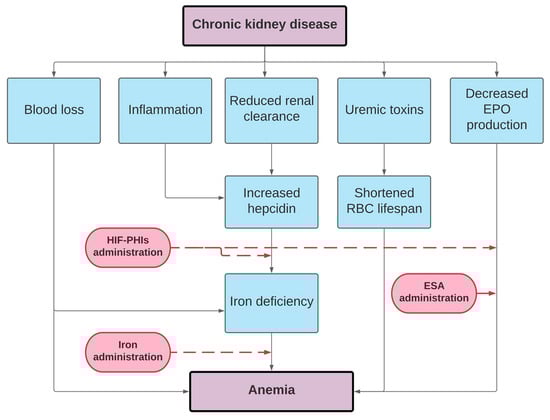 Chronic kidney disease (CKD) is one of the fastest-rising major causes of death internationally, with a global prevalence of 13% [1]. Better treatment of CKD and its complications is crucial to reverse this negative trend. Anemia is a frequent complication of CKD and is associated with unfavorable clinical outcomes [2,3]. The prevalence of renal anemia gradually rises as the estimated glomerular filtration rate (eGFR) decreases [3]. Anemia occurs in approximately half of patients with CKD stage G4 and in more than 90% of the end-stage renal disease patients who undergo dialysis [3,4,5]. Correcting renal anemia can decrease mortality, hospitalization, risk of CKD progression, and improve the health-related quality of life [5,6,7,8,9,10]. The principial mechanism implicated in the development of renal anemia is a combination of inadequate erythropoietin (EPO) synthesis and EPO resistance [11,12]. Other contributing factors include both absolute and functional iron deficiency, chronic inflammation, uremic toxins, disturbed iron homeostasis, shortened red blood cell (RBC) life span, and vitamin deficiencies (vitamin B12 or folic acid) [11,13]. Moreover, hemodialysis itself may contribute to blood loss and damage to RBCs [14]. Screening for and treating anemia is a routine part of the care of CKD patients [15].