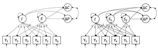 The linear LGCM (left) and the piecewise LGCM (right). Y = daily measurement of PTSD symptomatology using the 8-item PCL; I = intercept growth factor; S = linear slope growth factor; S1 = linear slope growth factor week 1; S2 = linear slope growth factor week 2; = difference in CAPS-5 before and after treatment; = difference in PCL-5 before and after treatment.
