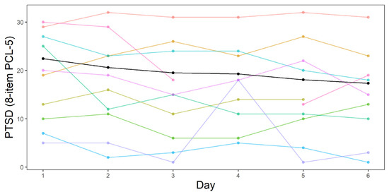 PTSD symptomatology during treatment, as measured with the 8-item PCL, of a sample of 10 participants (see the online Supplementary Materials for the complete sample). The y-axis represents total score on the 8-item PCL. The x-axis represents treatment day. The black line represents the observed mean PTSD symptomatology over time, whereas the colored lines represent individual trajectories.