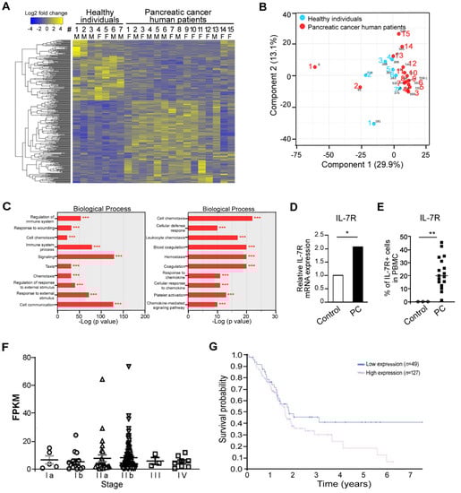Transcriptomic analysis of PBMCs from normal individuals and pancreatic cancer patients for biomarker discovery. (A) Heatmap showing relative gene expression [log2FPKM (fragments per kilobase million)] of 364 differentially expressed genes (DEGs) in PBMC between 7 normal healthy donors and 15 pancreatic cancer patients. Yellow and blue reflect high and low expression levels, respectively, as indicated in the scale bar (log 2 transformed scale). Each row represents a DEG, and each column represents a sample. List of differentially expressed genes are presented. (B) Multidimensional scaling of transcriptome analyses in these cells. Principal component analysis of transcriptome of healthy individuals (blue) and pancreatic cancer human patients (red), using gene expression counts for each group. Each dot represents one sample. (C) Top 20 biological processes associated with genes differentially expressed in PBMCs from pancreatic cancer patients. *** p < 0.001 versus healthy controls. (D) Elevated mRNA expression of IL-7R in PBMCs from pancreatic cancer (PC) patients as revealed by transcriptomic analysis. * p < 0.05 versus control. (E) Increased IL-7R positive cells in PBMCs from pancreatic cancer (PC) patients compared with healthy controls (Control). ** p < 0.01 versus control. (F) Analysis of IL-7R expression in pancreatic cancer of the human protein atlas. (G) Kaplan-Meier survival curves for PDAC patients with low IL-7R expression or high IL-7R expression (http://v20.proteinatlas.org; www.proteinatlas.org/pathology, Version 20.0 updated on and accessed on 19 November 2020).