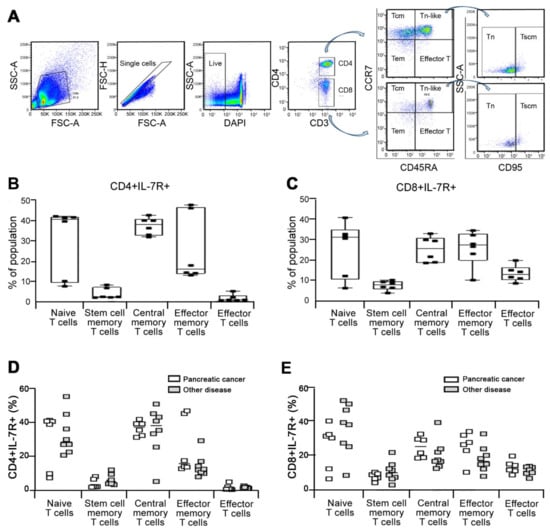Characterization of IL-7Rα expressing cells in T lymphocytes. (A) Representative gating strategy for identification of IL-7Ra expressing cells in T lymphocytes based on expression of cell markers including CD3, CD4, CD45RA, CCR7, and CD95 to define naive (CD45RA+CCR7+CD95-), stem cell-like memory (Tscm, CD45RA+CCR7+CD95+), central memory (Tcm, CD45RA-CCR7+), effector memory (Tem, CD45RA-CCR7-) and effector T cells (CD45RA+CCR7-) among CD4+CD3+ T cells. (B,C) PBMC were isolated from pancreatic cancer patients (n = 6). The abundance of IL-7R+ cells were evaluated in naive, stem cell-like memory, central memory, effector memory, and effector T cells among CD4+CD3+ T (B) and CD8+CD3+ T (C) cells in PBMC isolated from patients with pancreatic cancer (n = 6) and other disease (n = 8) including acute pancreatitis (n = 1), pancreatic cysts (n = 1), chronic pancreatitis (n = 1), bile duct cancer (n = 3), lung cancer (n = 1), and cholangiocellular carcinoma (n = 1) by flow cytometry analysis. (D,E) The percentage of IL-7R+ cells was determined in these cells among CD4+CD3+ T (D) and CD8+CD3+ T (E) cells from (B,C).