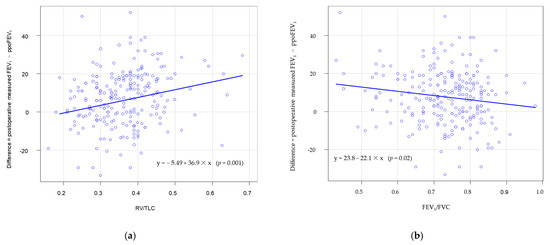 In the univariate linear regression analysis (Table 4), preoperative FEV1 (p = 0.032), FEV1/FVC (p = 0.020) showed a significant negative correlation, and RV/TLC (p = 0.001) showed a significant positive correlation with a difference. The scatter plot for difference and RV/TLC is presented in Figure 1a. The scatter plot for FEV1/FVC is provided in Figure 1b. In the multiple linear regression analysis (Table 4), RV/TLC was the only significant variable that was positively correlated with statistically significant difference (p = 0.004).