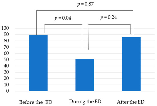 The number of biliary and pancreatic endoscopies decreased. There was no significant difference in the number of pancreaticobiliary endoscopies performed per month among the three groups (67.8/62.5/69.0 cases), whereas the number of EUSs was 89.8, 51.5, and 86.0, a 42.7% decrease between before and during the ED. Multiple comparisons showed a significant reduction between before and during the ED (p = 0.04, Figure 1). The number of EUS-guided fine needle aspiration (EUS-FNA) cases also tended to be lower (17.8, 11.5, and 18.5 cases) during the ED, but the difference was not significant (p = 0.7) (Table 2).