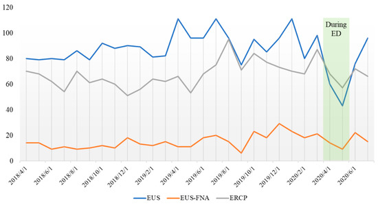 The number of pancreaticobiliary endoscopies decreased. The rate of EUS was significantly reduced by 42.7%, and that of EUS-FNA was reduced by 23.3% between during and before the ED.