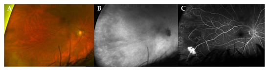 Multimodal imaging of a peripheral retinal neovascularization in a patient with stable disease. Ultra-widefield (UWF) fundus photography (CF, panel (A)), indocyanine green angiography fundus imaging (ICG, panel (B)) and fluoresceine angiography (FA, panel (C)) of a 72-year-old male patient (case 3) at 86 months of follow-up. Note the active retinal neovascularization in the temporal periphery. In this case, the use of ICG could not demonstrate a choroidal lesion.