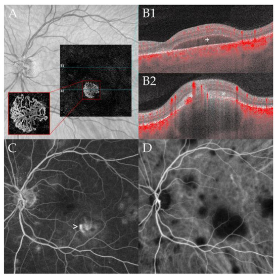 Macular neovascularization associated with choroidal granuloma. Optical coherence tomography angiography (OCTA, panel (A)) of a 53-year-old male patient (case 4) at 36 months of follow-up demonstrating a macular neovascular vessels Type 1 in the en face OCTA scan of the outer retina choriocapillaris slab (red rectangle). Note the branching of many small capillaries and the presence of peripheral arcades in the higher magnification of the neovascular membrane. The corresponding B-scan with superimposed flow information (panel (B1,B2)) demonstrates subretinal fluid (B1) and subretinal hyperreflective material (*, (B2)) overlying a large choroidal granuloma. Note the subretinal hyperreflective material (*, (B2)) and the associated subretinal fluid (+, (B1)) leading to decreased vision. Multiple hyperfluorescent lesions at the posterior pole and middle periphery are visible in fluoresceine angiography (FA, panel (C)). Note the leakage of the lesion at the posterior pole related to the active neovascularization (arrow). Indocyanine green angiography (ICGA, panel (D)) shows disseminated hypofluorescent choroidal lesions including the large granuloma associated with the CNV; the lesions are more numerous compared to FA.