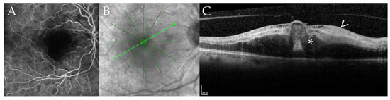 Cilioretinal vessel occlusion in a 67-year-old patient with disseminated Mycobacterium chimaera infection. Fluoresceine angiography (FA, panel (A)), near infrared imaging (NIR, panel (B)), optical coherence tomography B-scan (OCT, panel (C)) of case 12 at 18 months of follow-up. Panel (A) shows a filling defect of the cilioretinal vessel in the early frames of the FA; the inferotemporal and superotemporal arteries are already filled. Panel (B) shows the NIR image with the location of the B-scan (light green arrow) shown in panel (C). Note the defocusing of the macular region. The corresponding B-scan (Panel (C)) demonstrates hyperreflectivity of the inner retinal layers (arrow) and macular edema (asterisk) secondary due to ischemia after cilioretinal vessel occlusion.