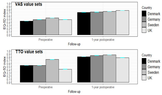 - Nemes, S.; Burström, K.; Zethraeus, N.; Eneqvist, T.; Garellick, G.; Rolfson, O. Assessment of the Swedish EQ-5D experience-based value sets in a total hip replacement population. Qual. Life Res. 2015, 24, 2963–2970. [Google Scholar] [CrossRef]