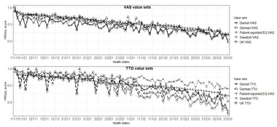 - Wittrup-Jensen, K.U.; Lauridsen, J.T.; Gudex, C.; Pedersen, K.M. Generation of a Danish TTO value set for EQ-5D health states. Scand. J. Public Health 2009, 37, 459–466. [Google Scholar] [CrossRef]