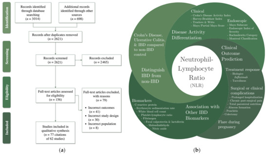 (a) PRISMA flow diagram of study selection; (b) identified categories of utility for neutrophil–lymphocyte ratio.