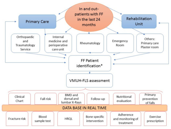 We included patients of ≥50 years old, cared for in the VMUH-FLS for an FF occurring in the previous 24 months. They agreed to participate in the study and gave their informed consent. FF was defined as a confirmed X-ray bone fracture, which derives from trauma that under normal conditions does not cause a fracture, after a fall from the patient’s height and without acceleration mechanism. In the case of having two or more FFs, the index was coded with the greatest impact on physical function, quality of life, and mortality (hip, vertebra, humerus, distal end of radius (DER), and any others in the same order).