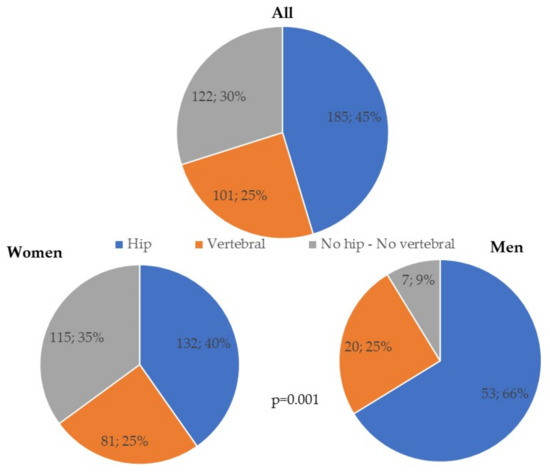 Type of bone fragility fractures in all patients and by sex. No hip-No vertebral fragility fractures include distal radius end n = 65 (16%), humerus n = 32 (8%), tibia n = 5 (1%), fibula n = 4 (0.9%), tibia and fibula n = 4 (0.9%), ribs n = 4 (0.9%), pelvic fracture n = 4 (0.9%), elbow n = 2 (0.4%), patella n = 2 (0.4%) and one distal femur.