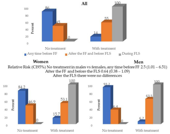 All patients, both women and men were treated after the VMUH-FLS intervention. The probability for a man not to receive treatment at some point prior to FF was 2.5 (CI95% 1.01–6.51); this difference lowered to 0.64 (0.28–1.09) in the referral unit after the FF; and disappeared in the FLS, as 100% of patients of both sexes received specific treatment.