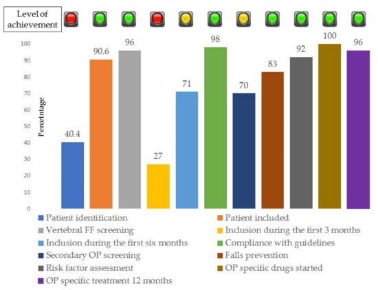 - Quality standard 9. Adherence of specific treatment for OP at 12 months. The nurse contacted all patients by phone at 3, 6, and 12 months. The adherence at 12 months was 95%. This information was compared with the review of the dispensing of the drug in the electronic prescription and the fulfilment at 12 months was 94%. The indicator received a green light.