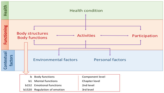 This shift in the therapeutic approach highlights the need for a tool that can assess the full spectrum of difficulties in functioning that a person may have, and all the contextual variables involved and which facilitates the coordination and joint work among all the professions involved in the recovery process. Moreover, achieving integrated care goals requires a common language and an understanding of the patient’s functioning problems among interdisciplinary team members. The International Classification of Functioning, Disability and Health (ICF [21]) covers all these requirements. The ICF, and the integrated biopsychosocial model on which it is based, represent a comprehensive and universally accepted framework for describing functioning, disability and health in persons with all types of health conditions. The ICF considers that problems associated with a disease can be related to Body functions, Body structures, and Activities and Participation in community life, which in turn are influenced by Environmental factors and Personal factors. Each of these components is structured hierarchically in chapters and categories (see Figure 1).
